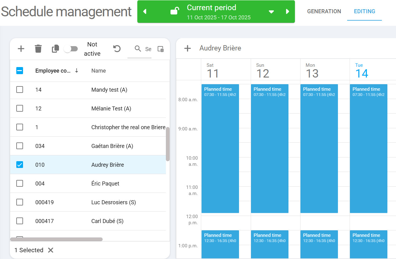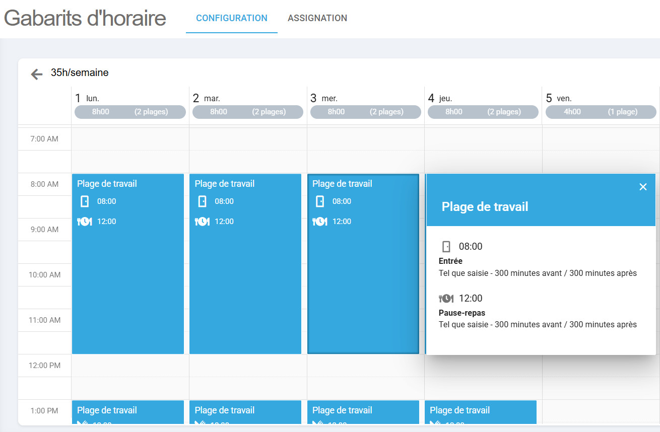 Choisissez parmi des gabarits hebdomadaires réguliers, des planifications bihebdomadaires ou optez pour des modèles variables. Minuto s'adapte à vos horaires, quels qu'ils soient.