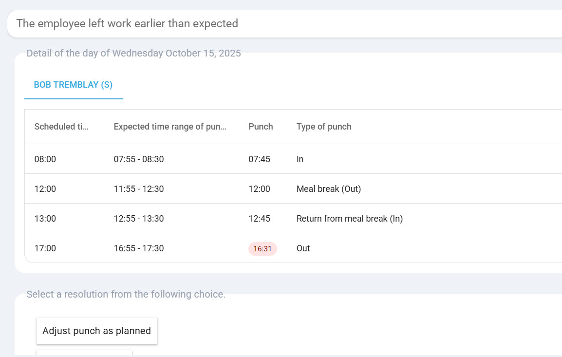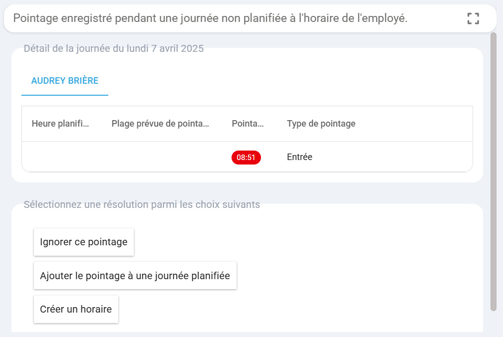 Minuto vous accompagne en proposant des choix de résolutions pour les non-conformités détectées. Gérez les exceptions avec facilité, tout en simplifiant la gestion des pointages.