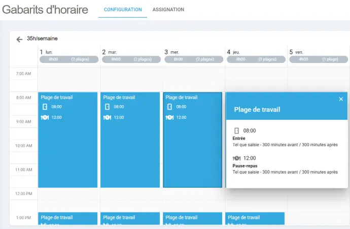 Les semaines se génèrent automatiquement à partir d’un gabarit et sont ajustables par l’employé.