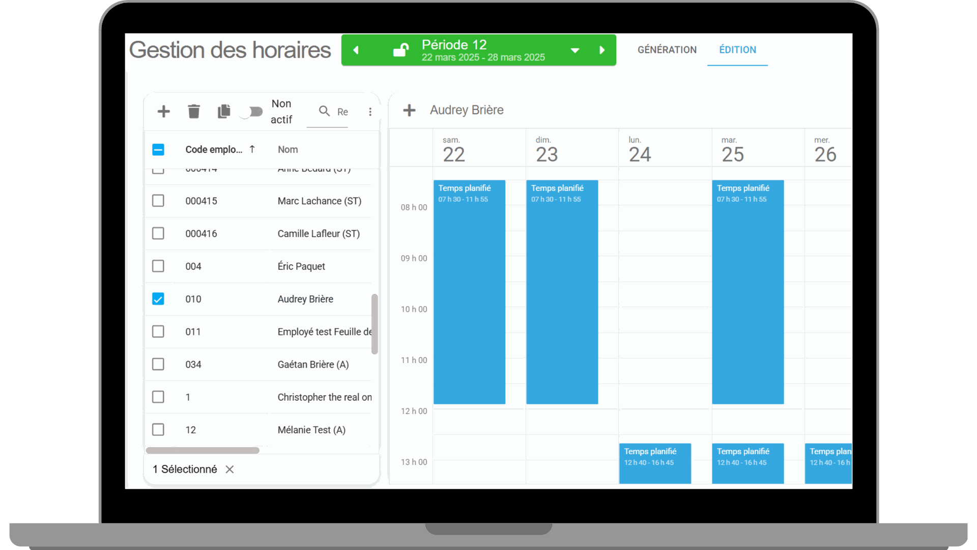 Choisissez parmi des gabarits hebdomadaires réguliers, des planifications bihebdomadaires ou optez pour des modèles variables. Minuto s'adapte à vos horaires, quels qu'ils soient.